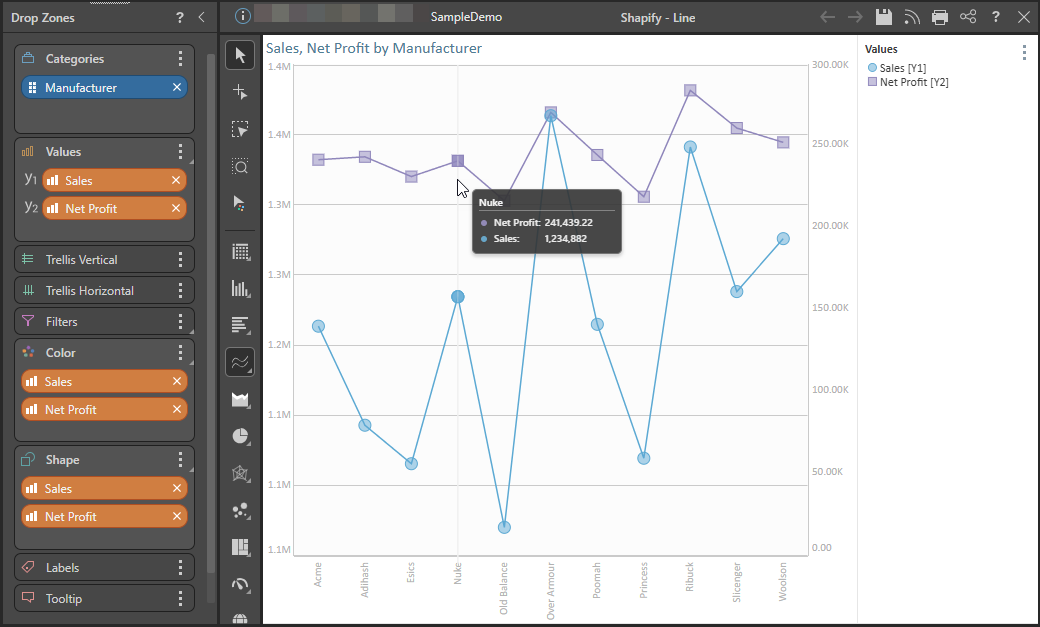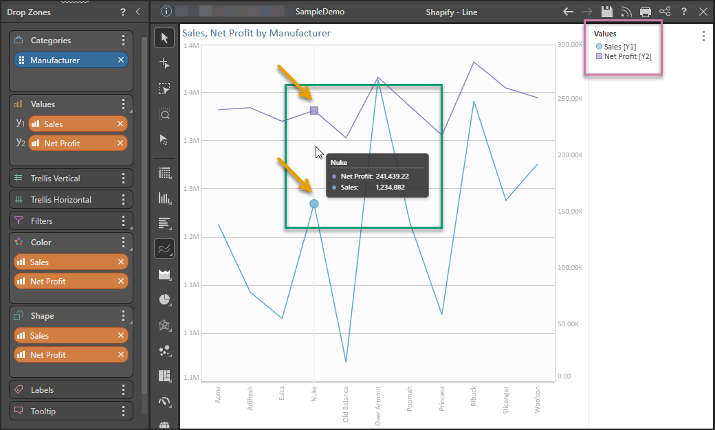For example, this functionality allows you to render data points for Sales measures as circles and Net Profit as squares: