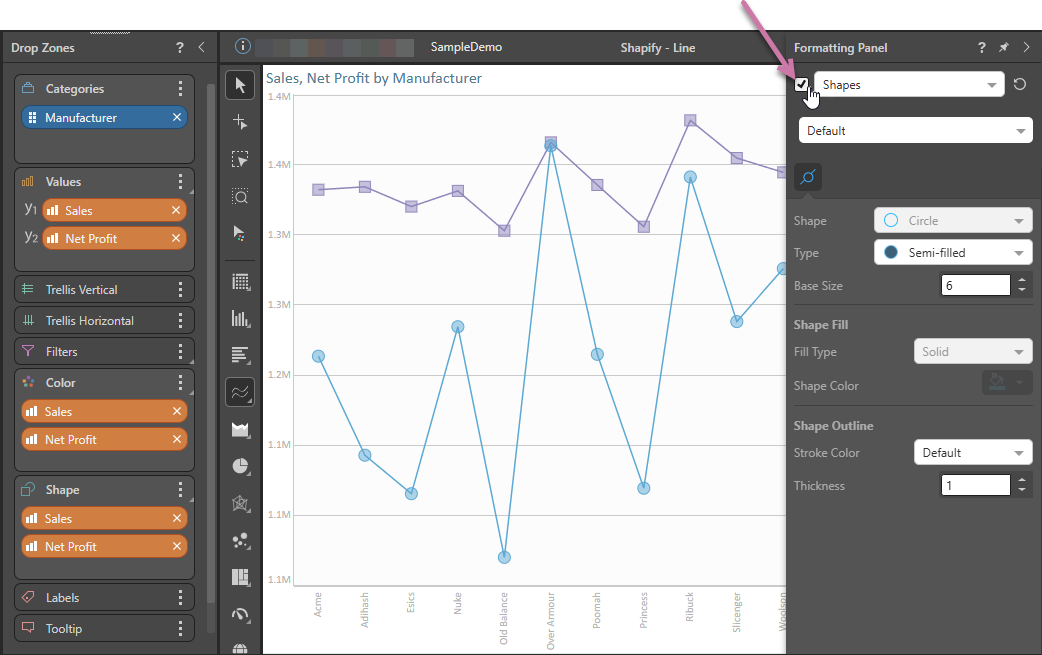 The Shape drop zone and the Shapify option in the Values drop zone are enabled when working with charts that display Data Points. Charts that can display data points include Line, Point, Lollipop, Area, Stream, Plotted, and Radar charts.