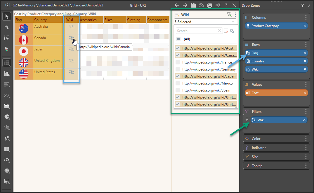 Once the hierarchy is added to a drop zone, you can hover over the link to view its URL in a pop-up, and click to open the linked location in a new browser tab. In the following example, each link (blue highlight) opens a Wikipedia article about the corresponding country: