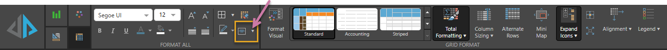Use the grid font alignment drop-down to alignment for text and data in the grid. Depending on your selection, the chosen alignment can be applied to the entire grid, or to specified rows or columns.