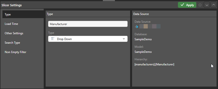 - Type: Select a slicer type from the drop-down menu. Slicer types include drop-downs, buttons, and so on. When you change the slicer type, you change both the appearance of the slicer and its settings.