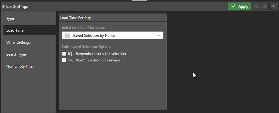 Subsequent selection options determine whether the user's slicer selection will be saved. Any selection will override the Initial Selection Mechanism (above).