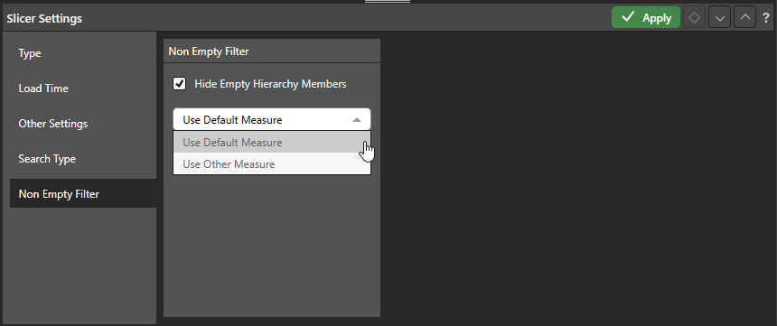 - Use Default Measure: (Default.) Hierarchy members with no values in the data model's default measure will be hidden from the slicer.
