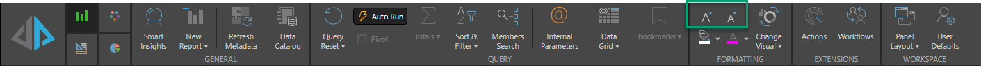 To change the font size, toggle the font size icons (green highlight below) from the Report ribbon.