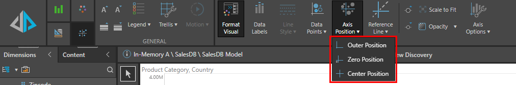 The Axis Position drop-down is used to set the physical position of the x- and y-axes when working with plotted charts and radar charts. There are three axis positions: outer position, zero position, and center position.
