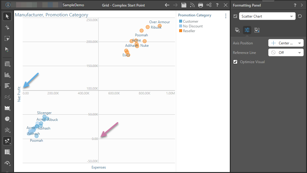 • Outer Position: Both the x- and y-axes are positioned along the outside of the chart, with minimum scale values starting at the values automatically determined by Pyramid (unless a custom scale limit is configured from the Axes Options dialog).