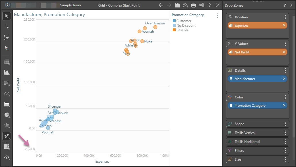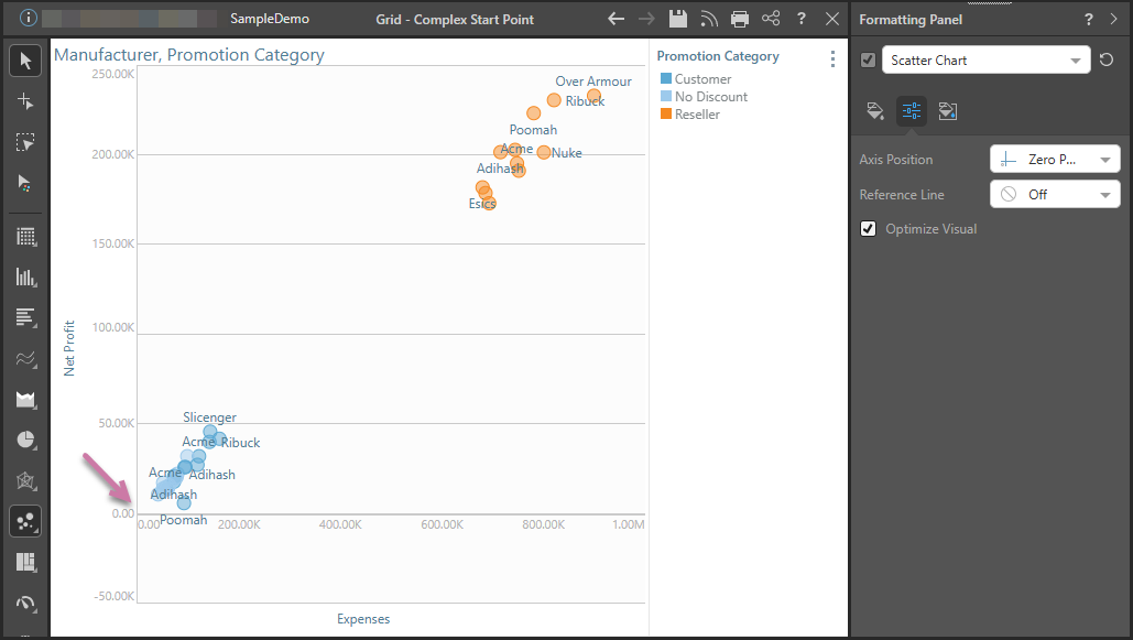 Here, Outer Position was selected on the Component ribbon or Formatting panel, so that the x-axis intersects with the smallest scale limit on the y-axis, which is -50K (purple arrow below):