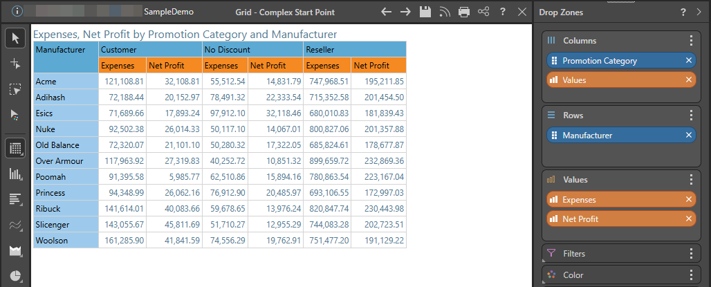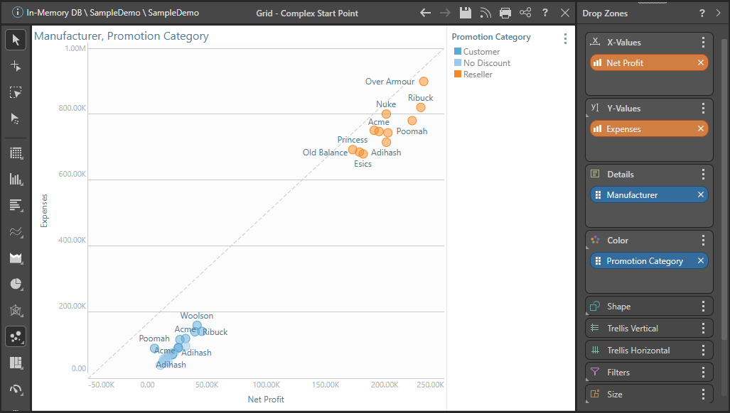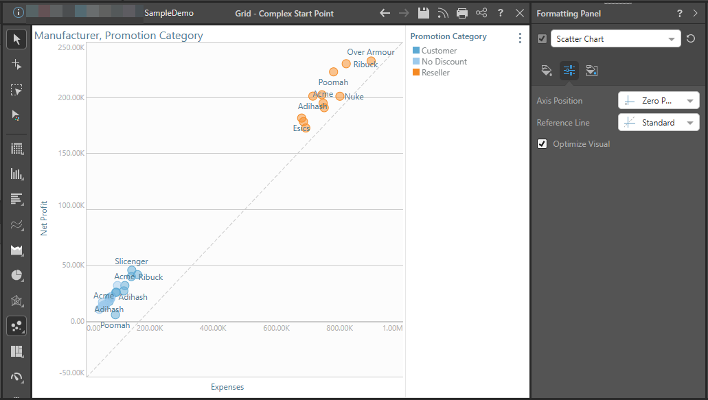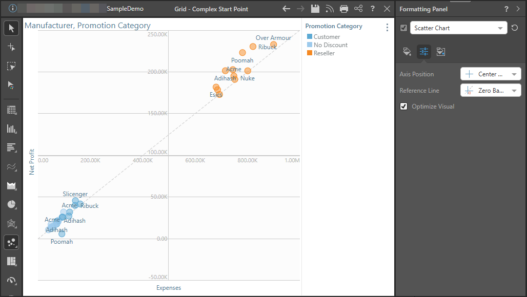For instance, here the axes were switched so that Net Profit is on the x-axis and Expenses on the y-axis. The zero based reference line still starts from the 0 value for Net Profit, starting from the x-axis rather than the y-axis.