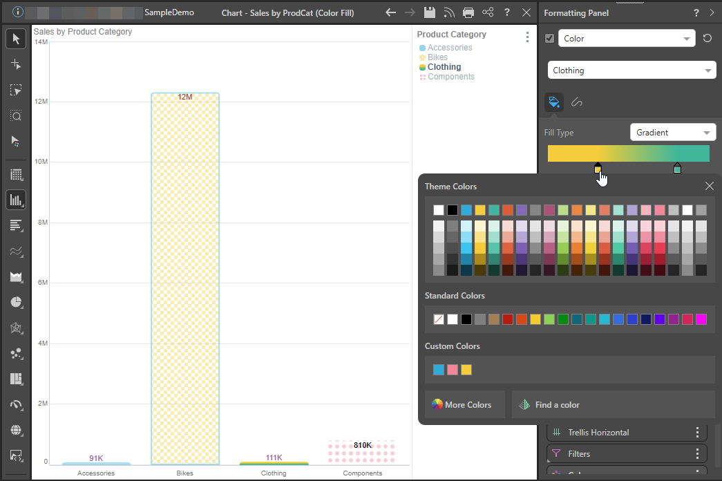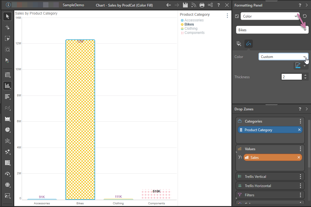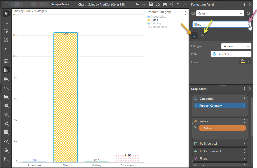 The options in the fill tab allow you to change the Fill Type (and Pattern, where the Pattern fill type is selected) and Color. The Target drop-down (purple arrow) indicates whether your changes apply "by default" or only to one of the items in the visual (in the following case, the Bikes column).