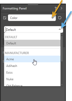 - With the Formatting panel open, select Color from the drop-down menu (orange arrow below), then select the series whose color you want to change from the next drop-down menu (blue arrow):