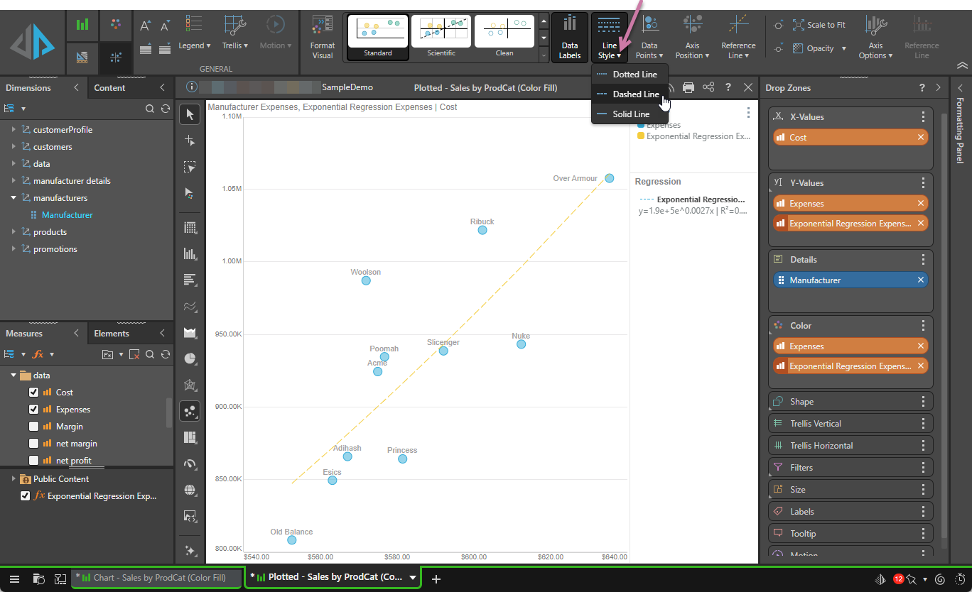 For line, area, radar, or, where they contain a regression line, plotted charts, the line style can also be set from the Line Style drop-down (purple arrow below) on the Component ribbon: