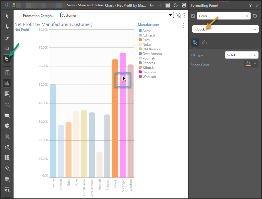 Alternatively, you can enable the formatting selector (green arrow below), click the series you want to edit directly in the visual (blue box), and then make use of the Formatting panel options. Note that your selected item is shown in the Formatting panel (orange arrow).