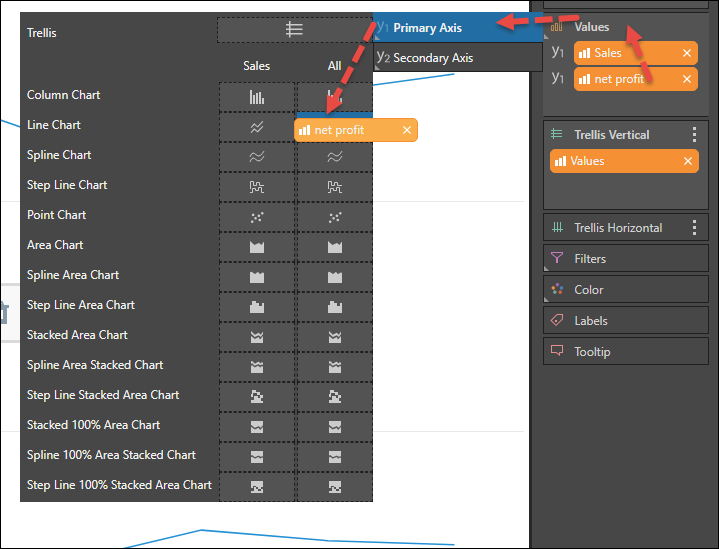 - Drag the measure over the required axis option, and in the next pop-out menu, drop the measure onto zone representing the required chart type and axis (see 'Multiple Values for Trellised Charts' below).