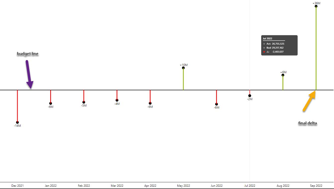 The above chart shows turnover for a period of several months, comparing it with the operating budget, which is represented by the line running along the middle of the chart (indicated by the purple arrow). The turnover fluctuates, in some months being less than the budget, as represented by the red lines on the chart - the green lines represent months when turnover exceeded budget, The final date point on the chart also displays the amount by which the turnover exceeds the budget (orange arrow). Hover over any point on the chart to display the actual turnover, the budget, and the difference (delta) between them.