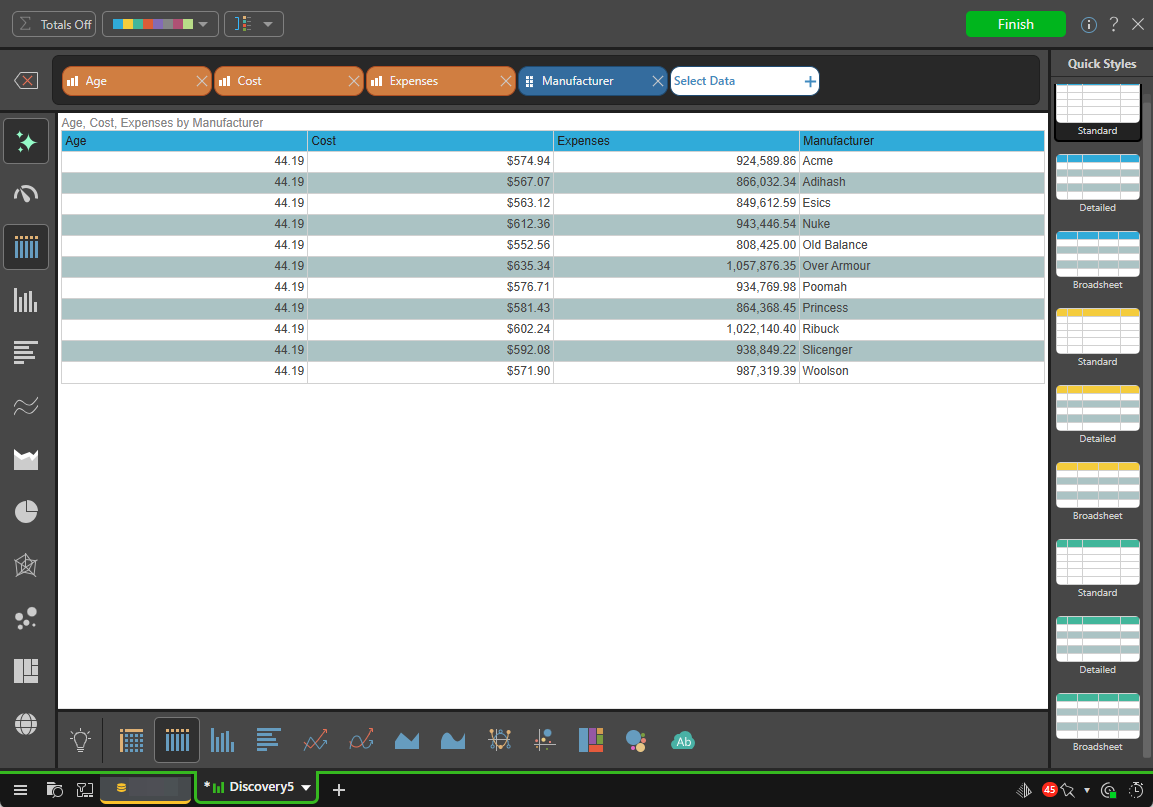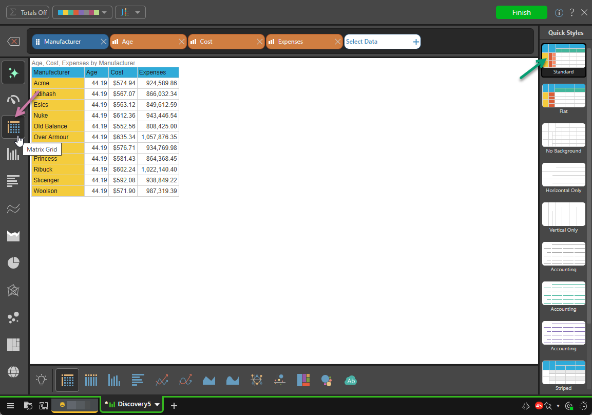 Quick style presets are available for grids, including different color schemes and line formatting. The preset options are as follows, for Grids and Matrix Grids: