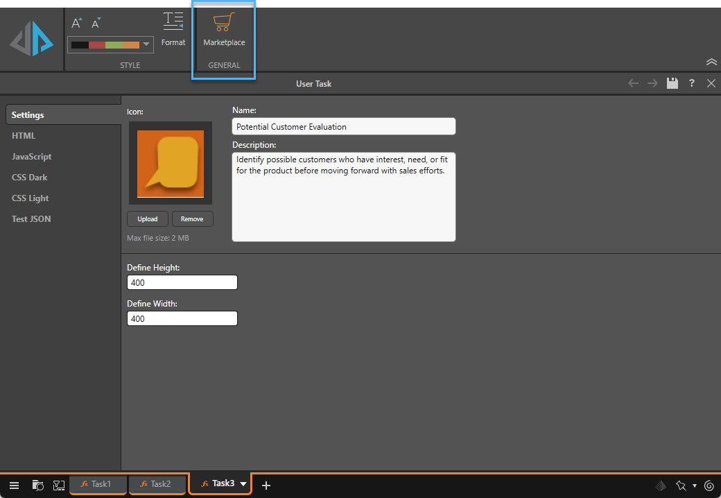 To view and select a User Task from the marketplace, click Marketplace in the Ribbon:
