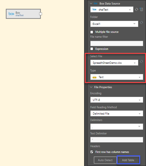 In this example, an Excel file is copied from the datasource and the file type is set to Text (red box below). The table is then added by clicking 'Add Table' from the File Properties window (blue box):