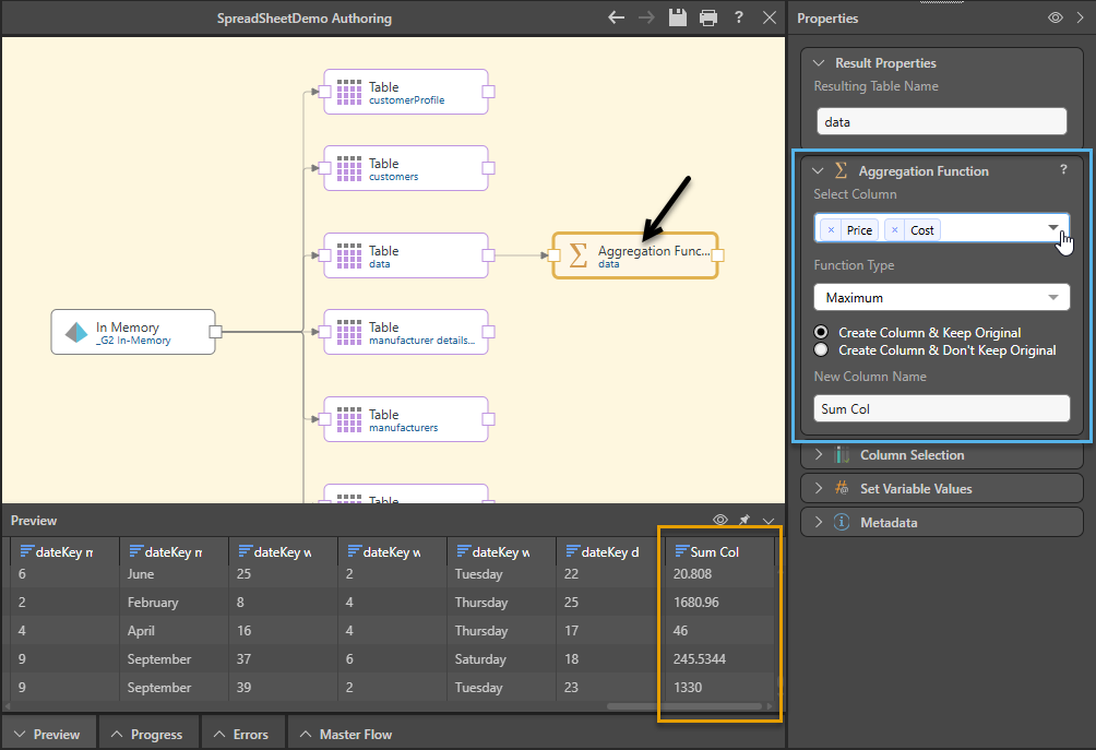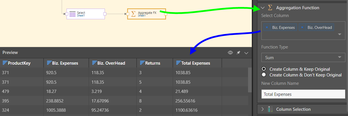 The Aggregation Function node is useful if end users have a need to analyze aggregations of multiple columns. For example, there may be a need for a column summing the cost and overhead to show all expenses.