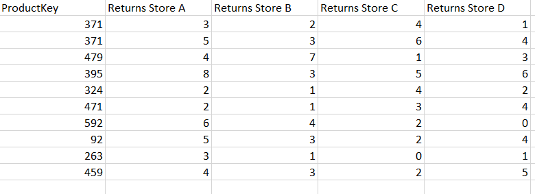 In this example, we have a table with 4 columns showing Returns; each Returns column shows data from a different store.