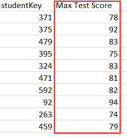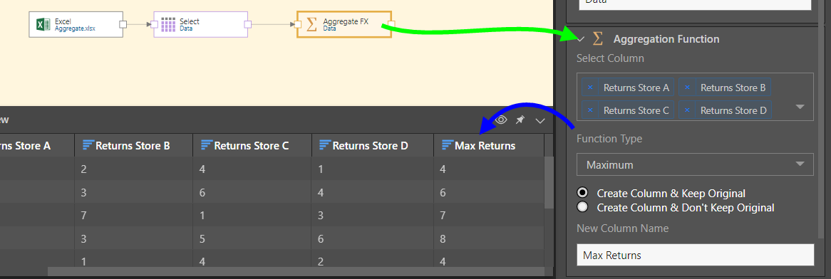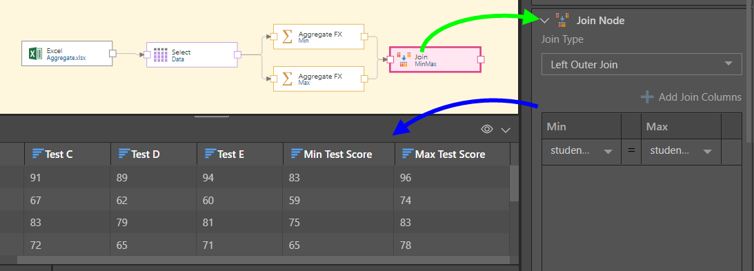To do this, we'll add a second Aggregation Function node to the original table, this time aggregating the test score columns by the Maximum function, and being sure not to keep the original columns (yellow highlight).