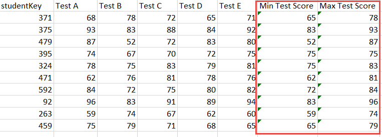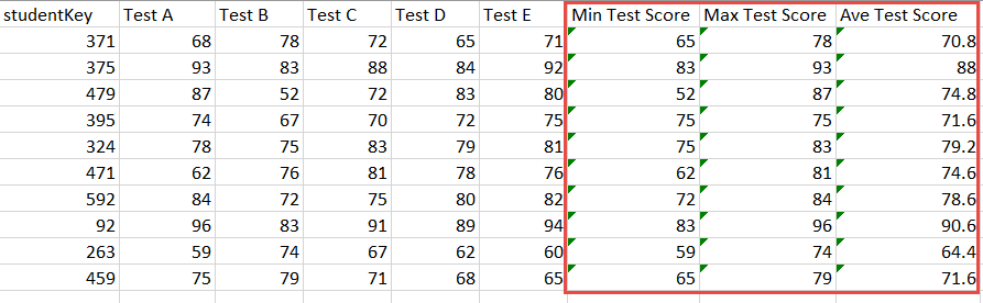 We'll start by aggregating all the test score columns by the Minimum function, to add the new Min Test Score column to the table: