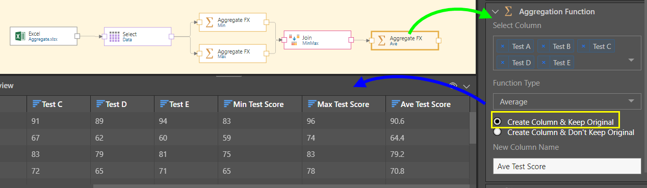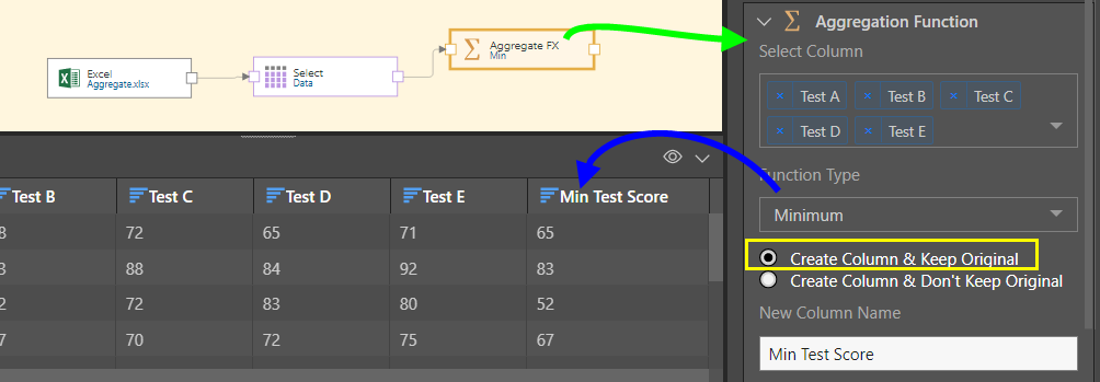 To do this, we'll connect the Aggregation Function node to the table node, and input all test score columns (green arrow below). We then select the Minimum function, and make sure to keep the original columns (yellow highlight). The new Min Test Score column is then visible, alongside the original columns, in the Preview (blue highlight):