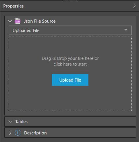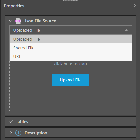 Start by adding the JSON source node and go to its Properties panel. Connect the required file by uploading it, or pasting a pointer to a shared file, or a URL address.