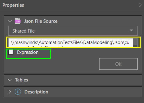 Enter the file path of the shared file (including the file name and extension) in the File Path field (green highlight below). Enable 'Expression' (yellow highlight) to provide the file path in the context a dynamic PQL expression, created in the PQL Editor.