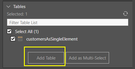The JSON file will be converted into a single table; select the table and click the 'Add Table' button.