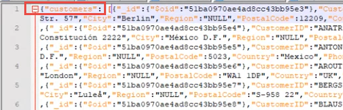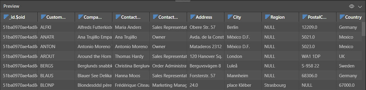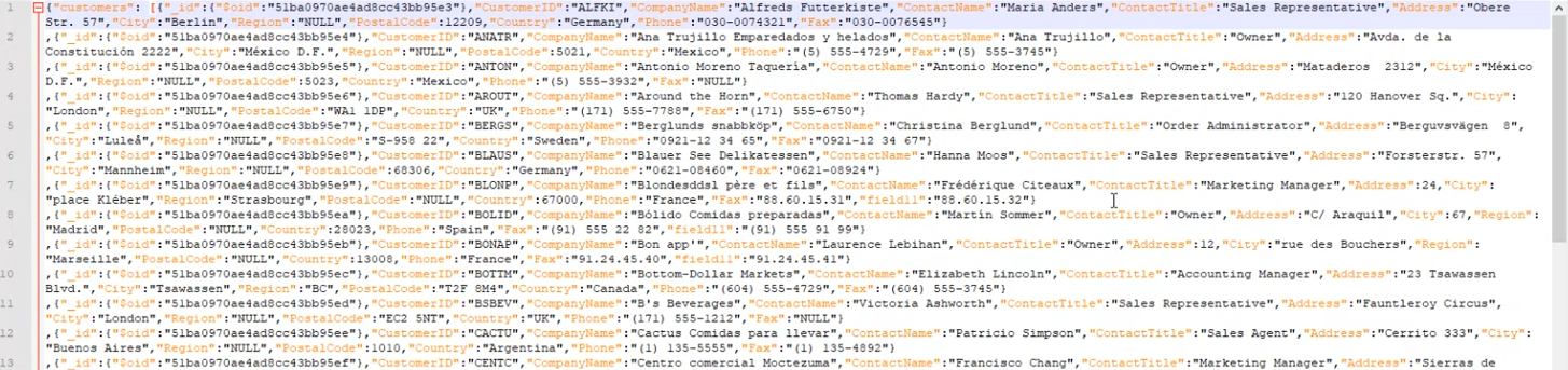 In this example, the user connected to the following shared JSON file, which contains custom data with field names like "CustomerID", "CompanyName", ContentName", "ContactTitle", and more.