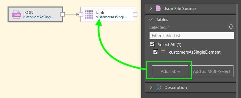 Once the JSON file's properties are set, the file is added to the data flow using the Add Table function (green highlight below):