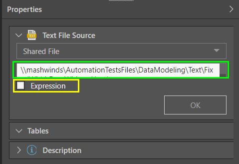 Enter the file path of the shared file (including the file name and extension) in the File Path field (green highlight below). Enable 'Expression' (yellow highlight) to provide the file path in the context a dynamic PQL expression, created in the PQL Editor.