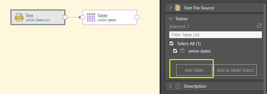 Pyramid connects to the file and converts it into a table, which is then added to the data flow using the Add Table function (yellow highlight below):