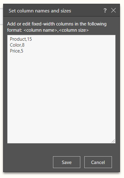 Clicking Edit Columns will open the 'Set column names and sizes' window; enter the column names and sizes in the following format: