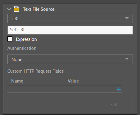 To connect to an XML file via its URL, paste the URL in the Set URL field. Enable 'Expression' to provide the URL in the context a dynamic PQL expression, created in the PQL Editor.