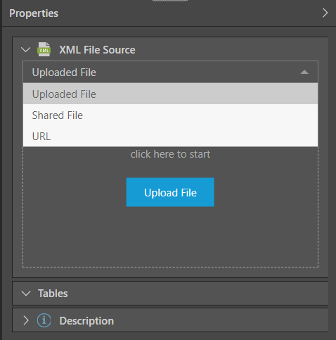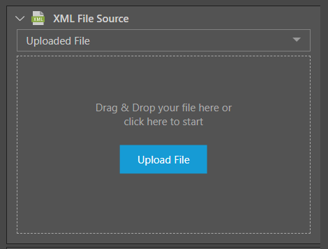 Start by adding the XML source node and go to its Properties panel. Connect the required file by uploading it, or pasting a pointer to a shared file, or a URL address.