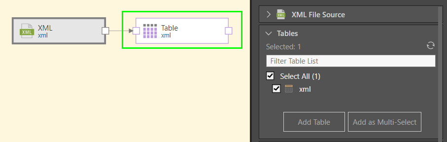 After setting the XML properties, the table is added to the data flow by clicking Add Table from the Tables window: