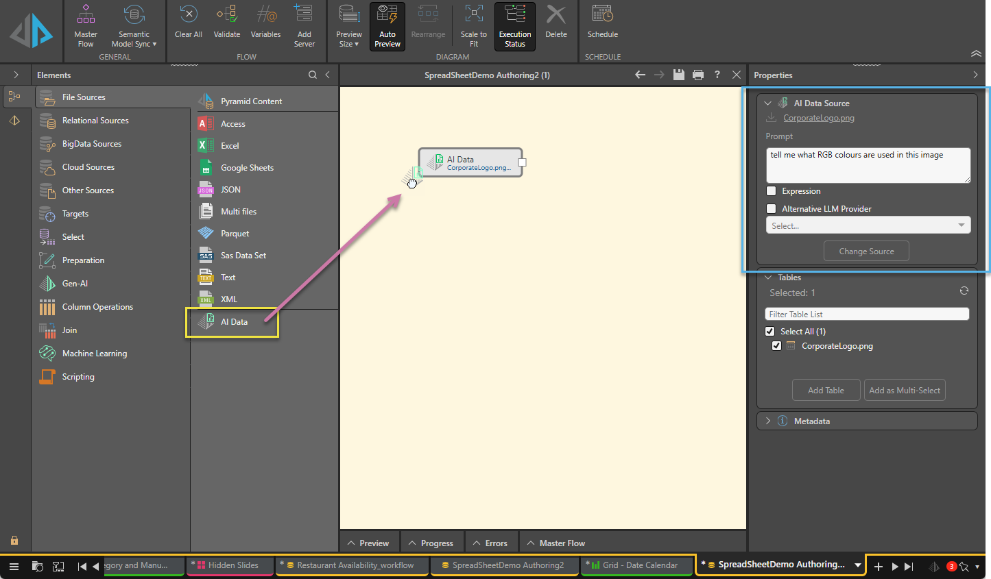 - Drag and drop the AI Data node from File Sources onto the Data Flow canvas (purple arrow below):