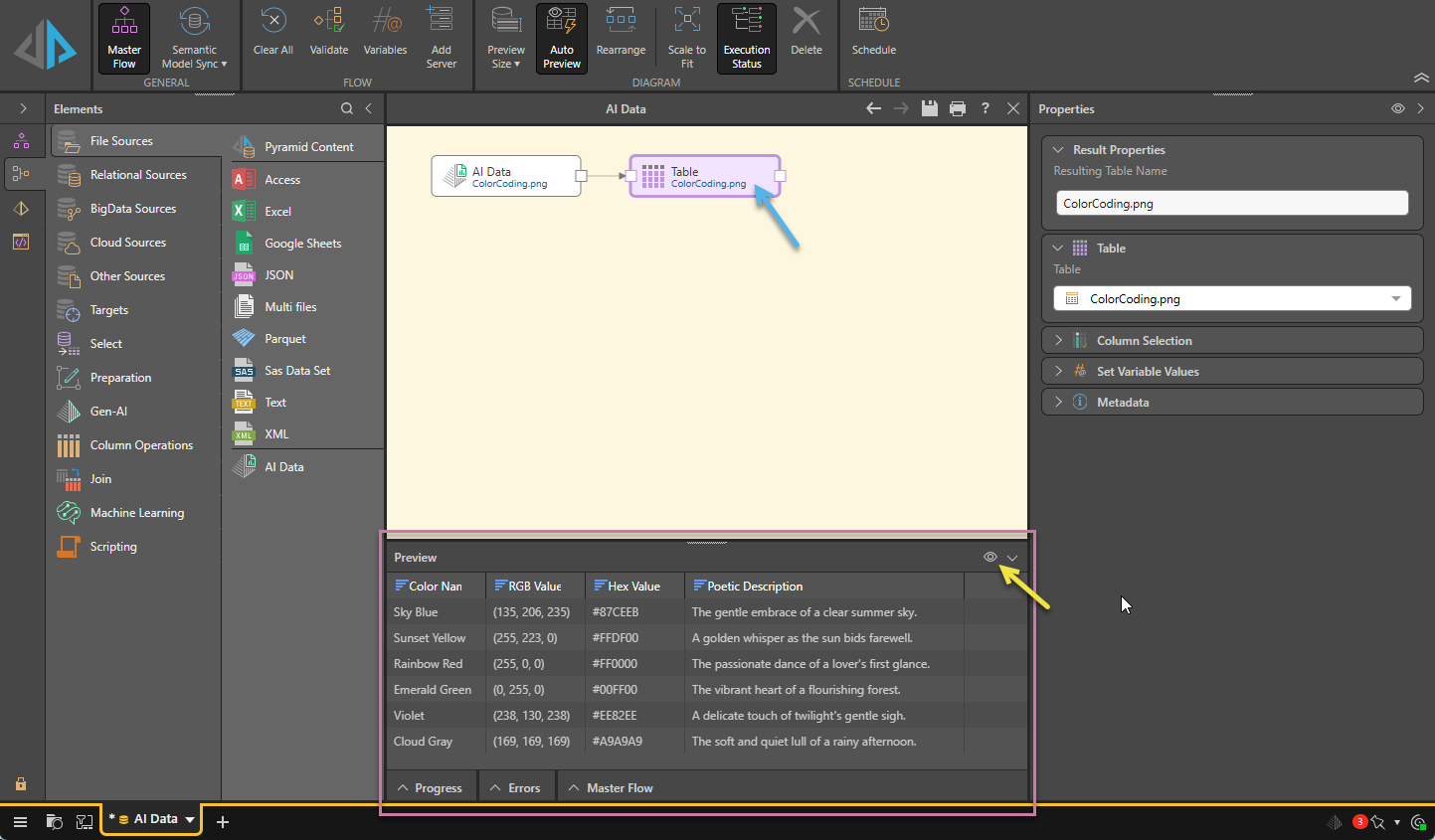 The input ColorCoding.png image is uploaded to the AI Data node on the canvas and a prompt is configured. In this case, the prompt describes some information about the colors in the image that you want to extract for your model. Clicking the Add Table button (orange arrow below) creates the table and connects it to the AI Data node.