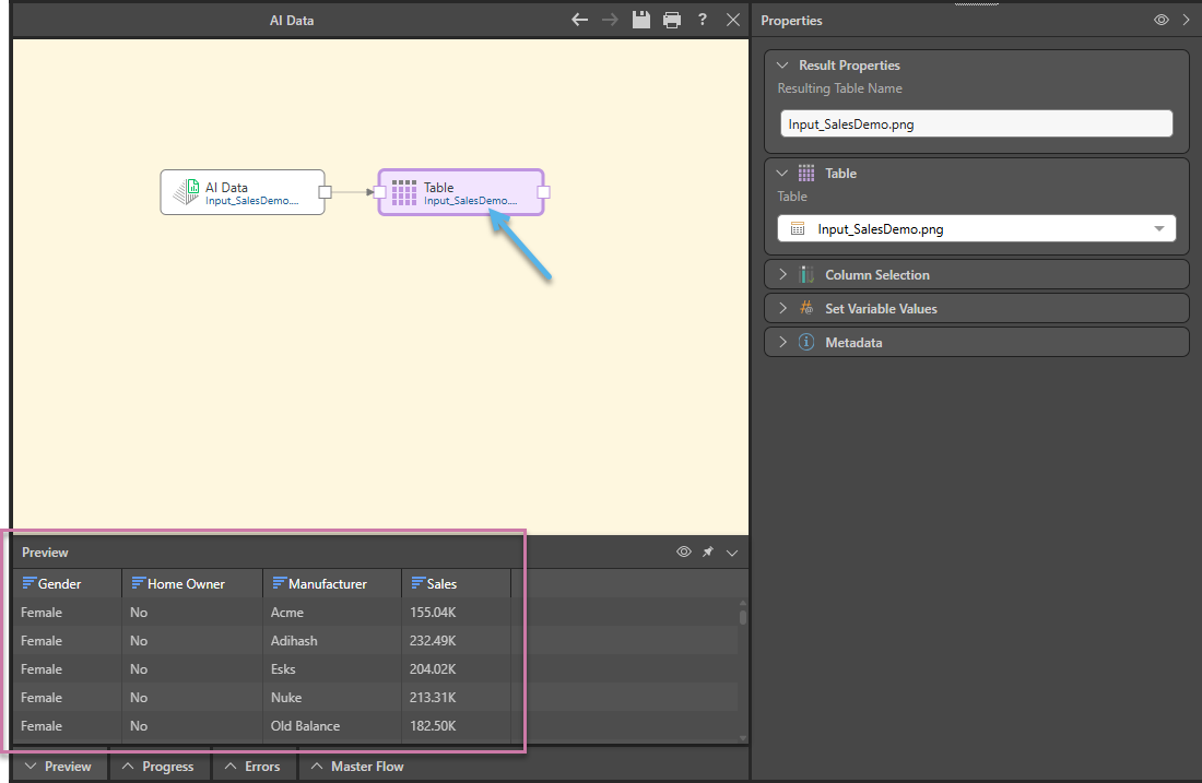 Selecting the Table node (blue arrow below) on the canvas opens the Preview panel at the bottom of the page: