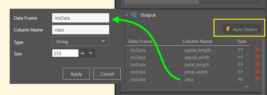 After providing the script, you'll need to define the output, including the data frame, column name, and data type for each column. Pyramid automatically enters the outputs for scripts downloaded from the Marketplace. For other scripts, you can configure the output manually column by column, or you can use the Auto Detect data frame support function. Auto Detect lets you provide the data frame once, and then Pyramid detects the data frame and columns in the script and adds them to the output.