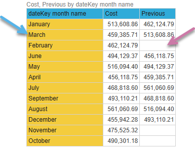 (([measures].[data Cost],[data].[dateKey month name].PrevMember)). You can see that the selection of the previous value is not predictable. For example, the Previous value for February is empty (purple arrow) but should match the previous value from January (513,608.86).