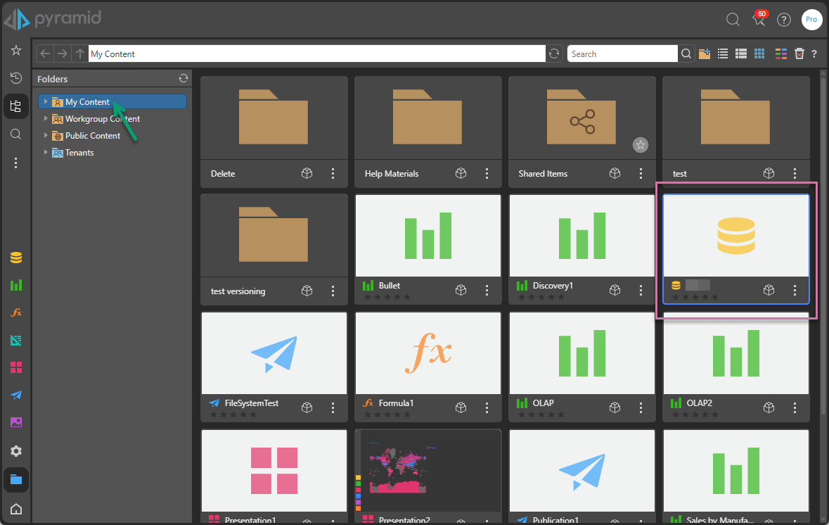 By default, definition files for smart models are stored in the My Content folder of the model builder. Navigate to the My Content folder and find the required definition file; these files are denoted by a yellow model icon. Click on the relevant file to open and edit it.