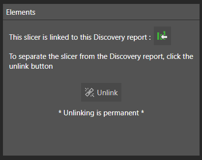 If your slicer was created in Discover, and has not been unlinked, you will see the following in the Elements panel: