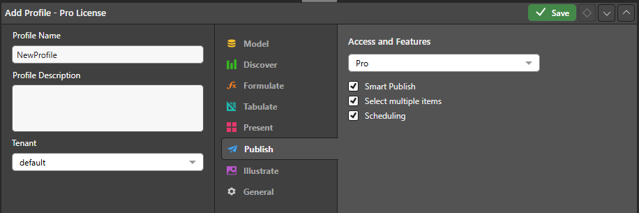 Administrators manage access to Publish through the Admin Console using a combination of Profiles and User Types. Profiles control the different authoring workflows and apps that Pro, Analyst, and Viewer users can access. Different profiles are defined and then applied at either the role level or user level. The User Type determines which Publish options will be available for the corresponding Profile (access to Publish Pro is supported for Pro users only).