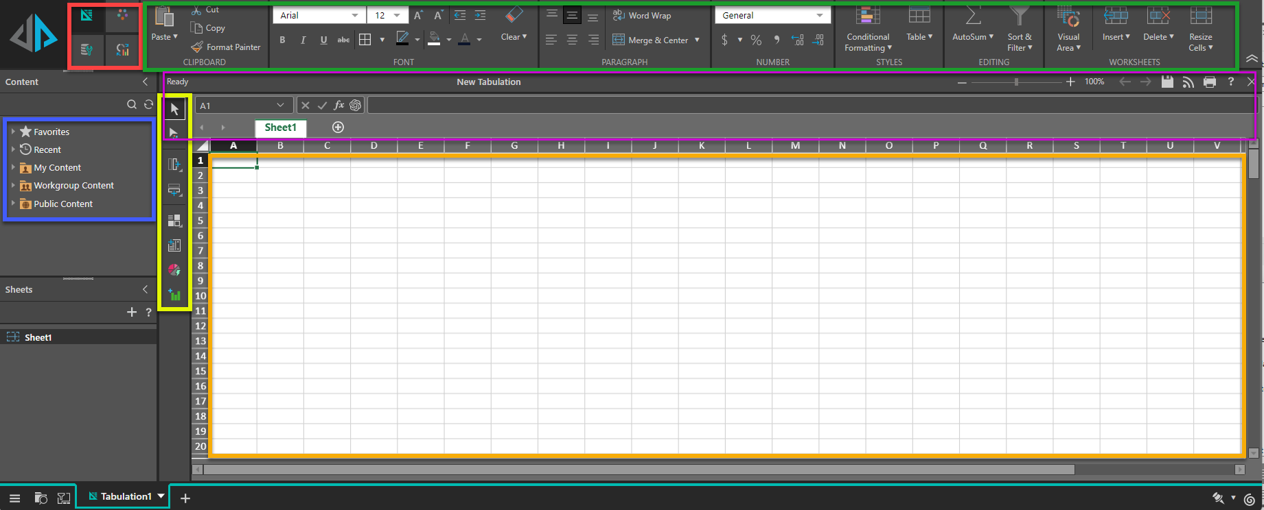 The Tabulate workspace is made up of the ribbons, a canvas, sheet controller and toolbox similar in design to other apps in Pyramid, with content appropriate to the functions available within Tabulate.