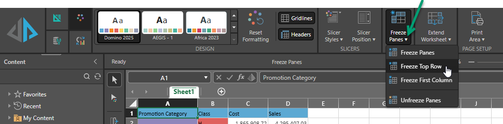 You access Freeze Panes (green arrow below) from the Design ribbon: