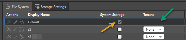 If the File System you want is not available on the drop-down, you may need to add it on the File Systems page. Note that File Systems with the Tenant option selected cannot be used for System Storage (green arrow above).