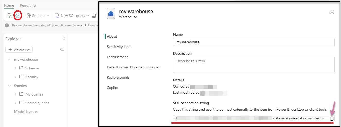 - From the Warehouse settings, copy the SQL connection string.