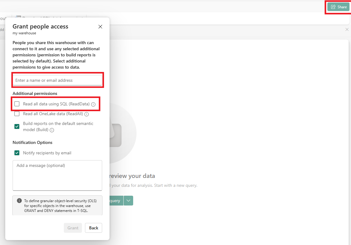 - Give the Azure service access to your warehouse by clicking Share and: